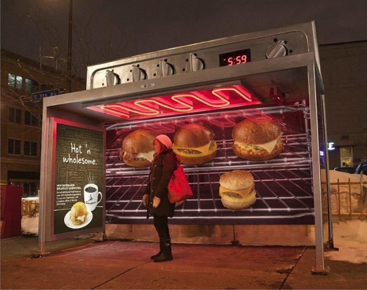 Autobusové zastávky Caribou Coffee zahřívají své návštěvníky a zároveň promují snídaňové menu. Zastávky vypadají jako velké trouby včetně funkčních topných spirál. Společnost Colle+McVoy z Minneapolis, USA, přišla s nápadem autobusové zastávky Caribou Coffee jako způsobem, jak přilákat zákazníky k jejich snídaňovému menu. Takový druh reklamy je vítán, neboť se lidé při čekání na zastávce zahřejí i bez toho, aby se stali zákazníky Caribou Coffee.